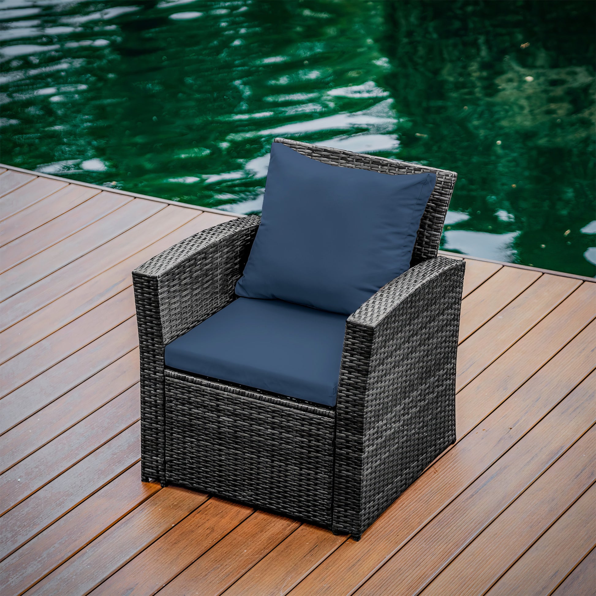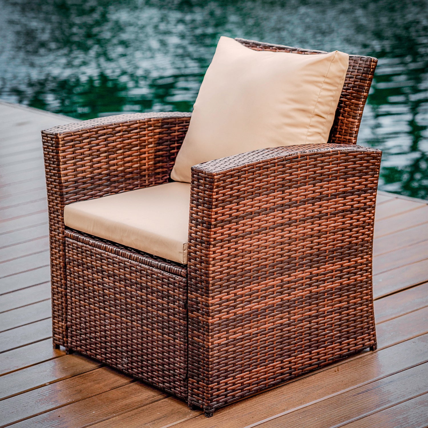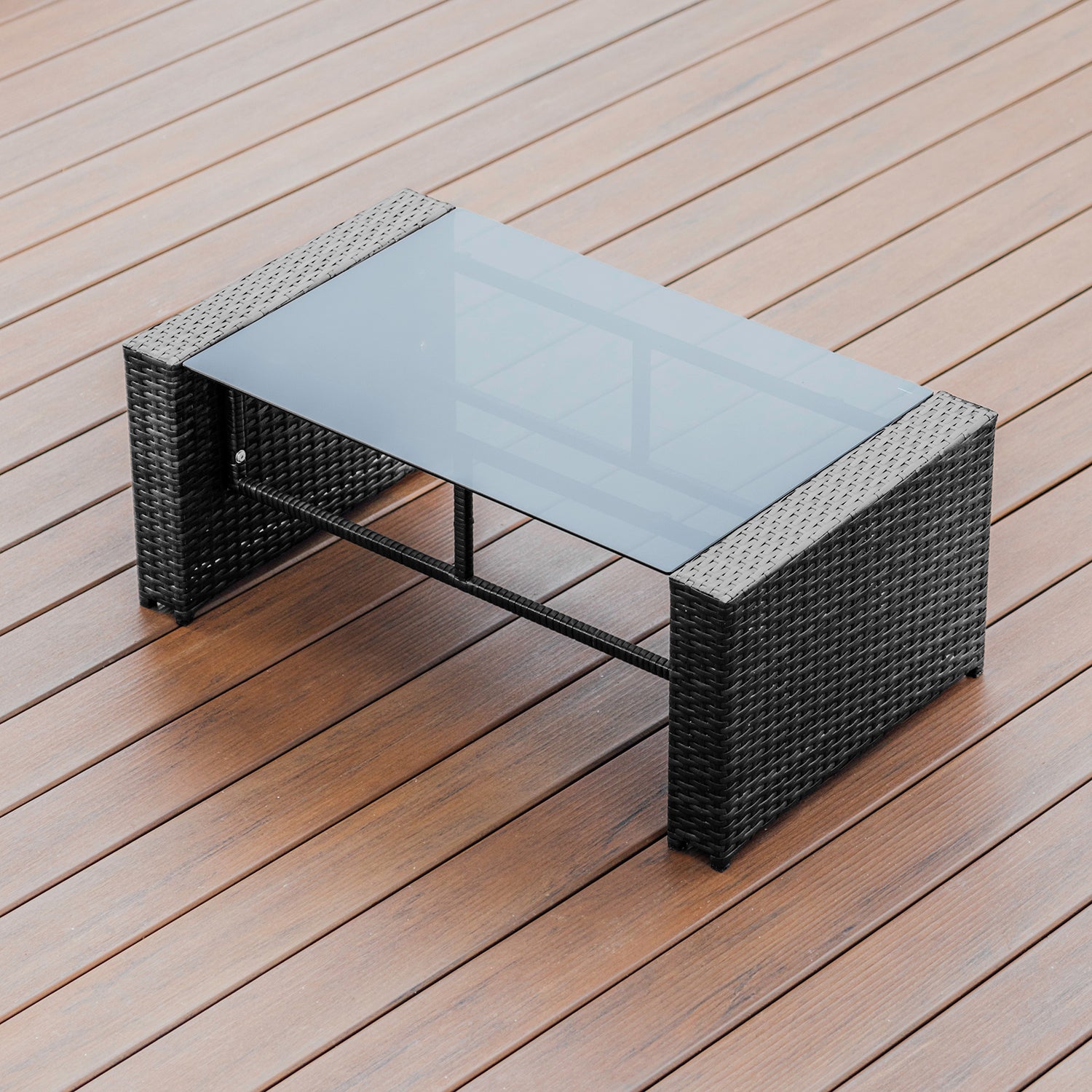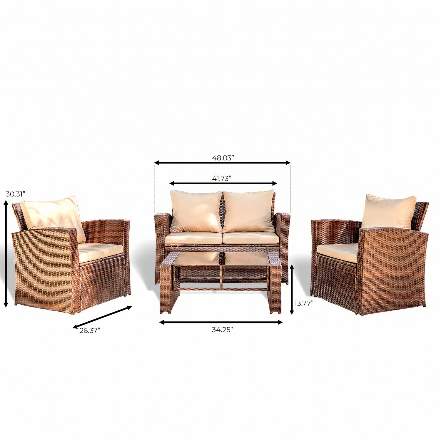 Your outdoor sanctuary awaits with our 4-Piece Outdoor Wicker Conversation Set, which includes two inviting garden armchairs, a charming loveseat, and a sleek coffee table. Relax into the plush seat cushions and lean back on the supportive back cushions, keeping refreshments close at hand on the glass-top coffee table, featuring black-tinted, tempered glass. Crafted from durable galvanized steel and polyrattan braid, this beautiful patio furniture set is waterproof and weather-resistant, ensuring years of enjoyment.