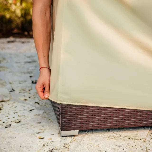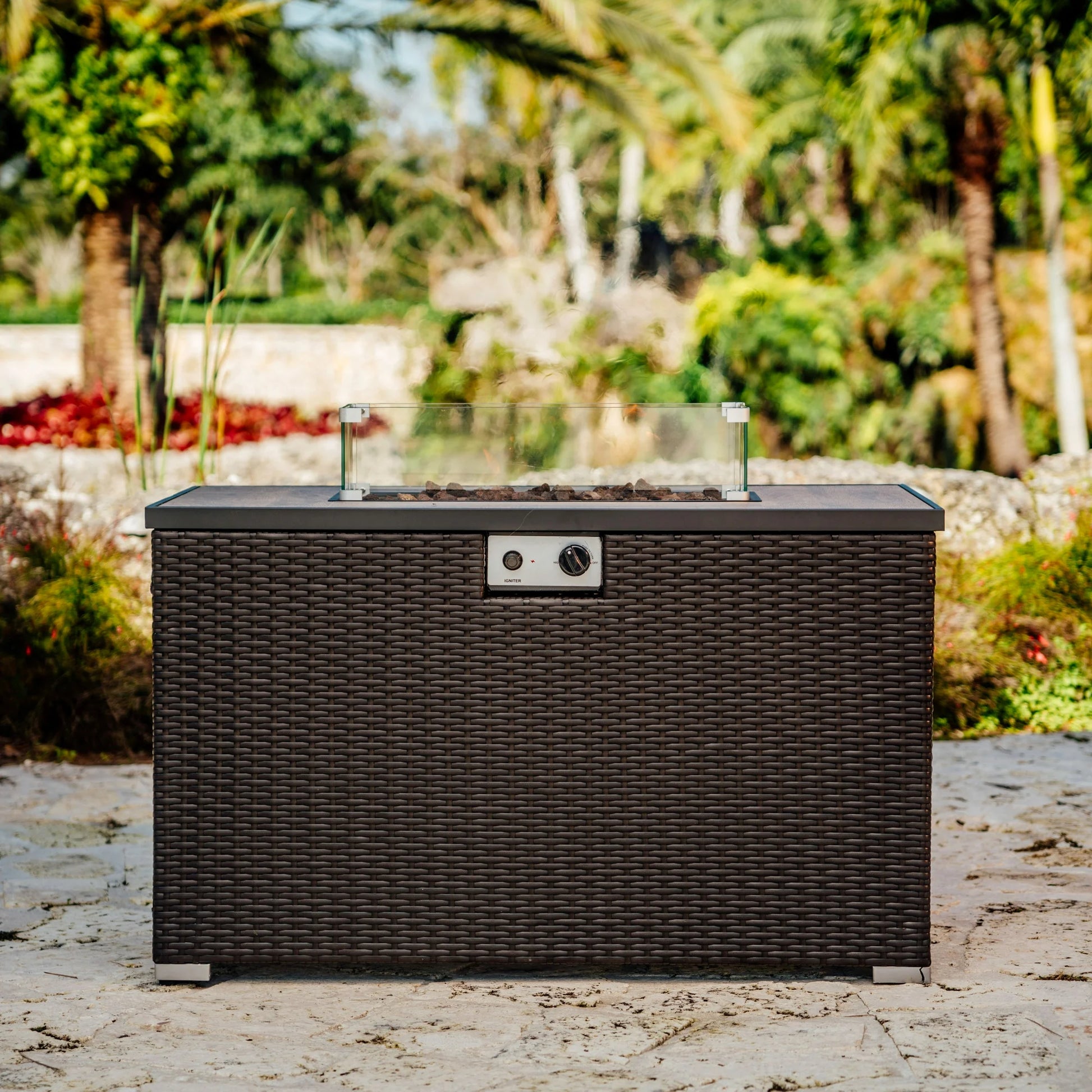 Ignite unforgettable moments with Hearth & Harbor’s 43” Fire Pit for outside, featuring electronic ignition for effortless operation, lava rocks for even heat distribution and natural ambiance, a ceramic tile top with a wood-grain design, and a tempered glass windshield. Made from galvanized steel and polyrattan wicker, our firepit table is built to last and includes a perfectly fitted, weatherproof protective cover. Whether you're hosting a soirée or simply unwinding with loved ones, our fire pit tables create a captivating focal point, inviting warmth and conviviality.