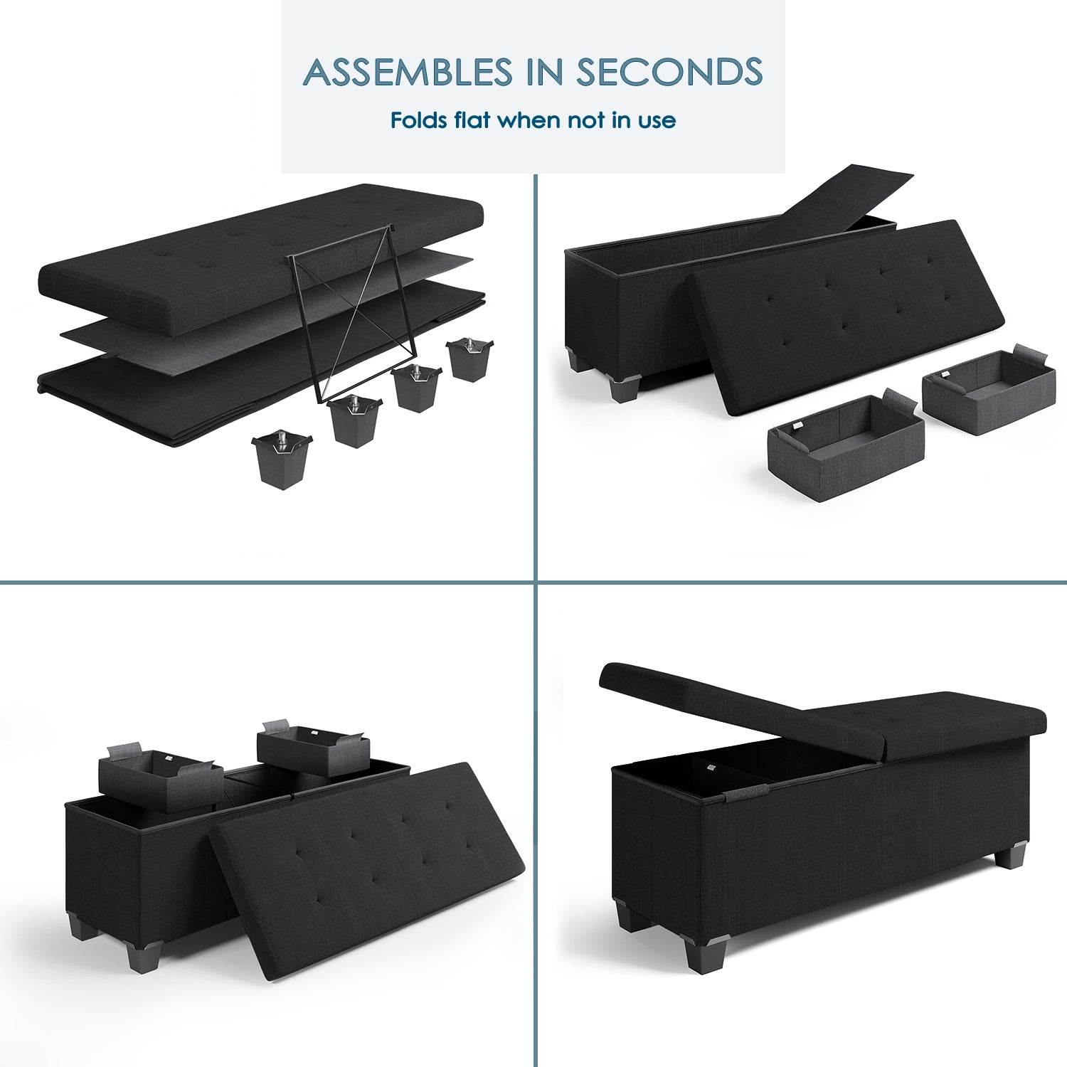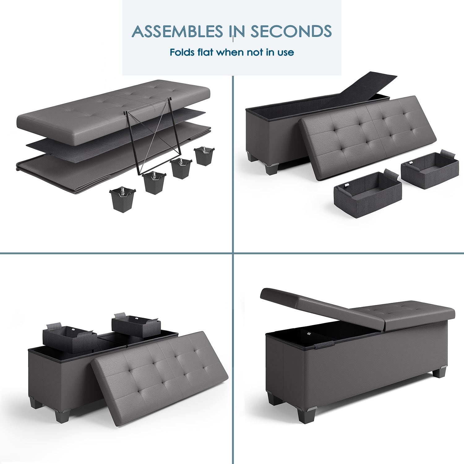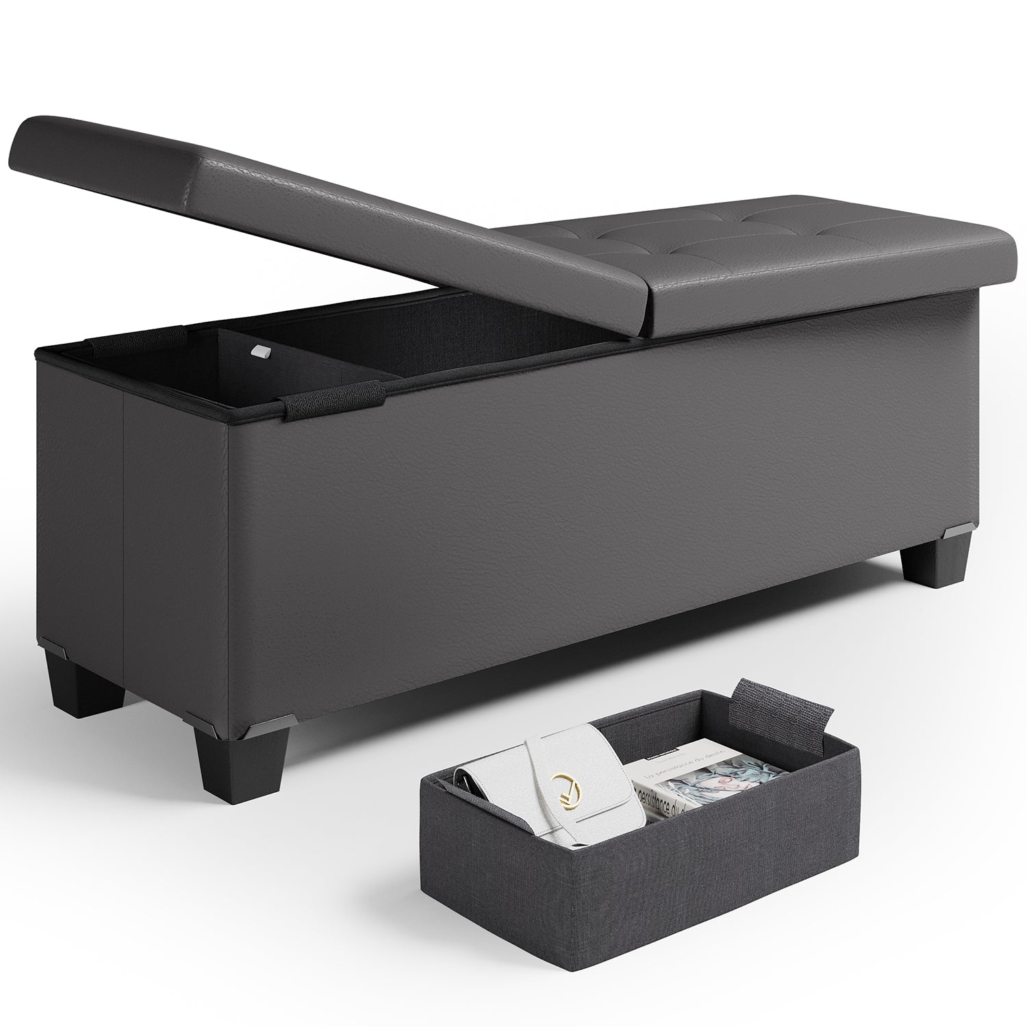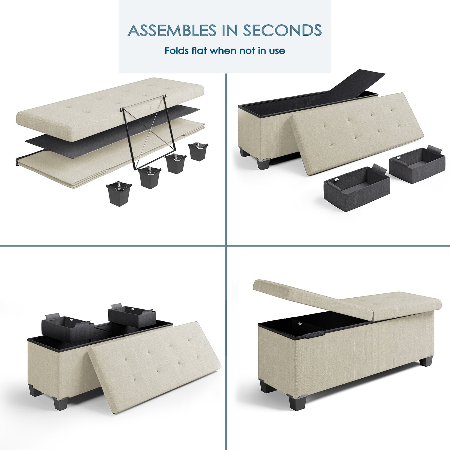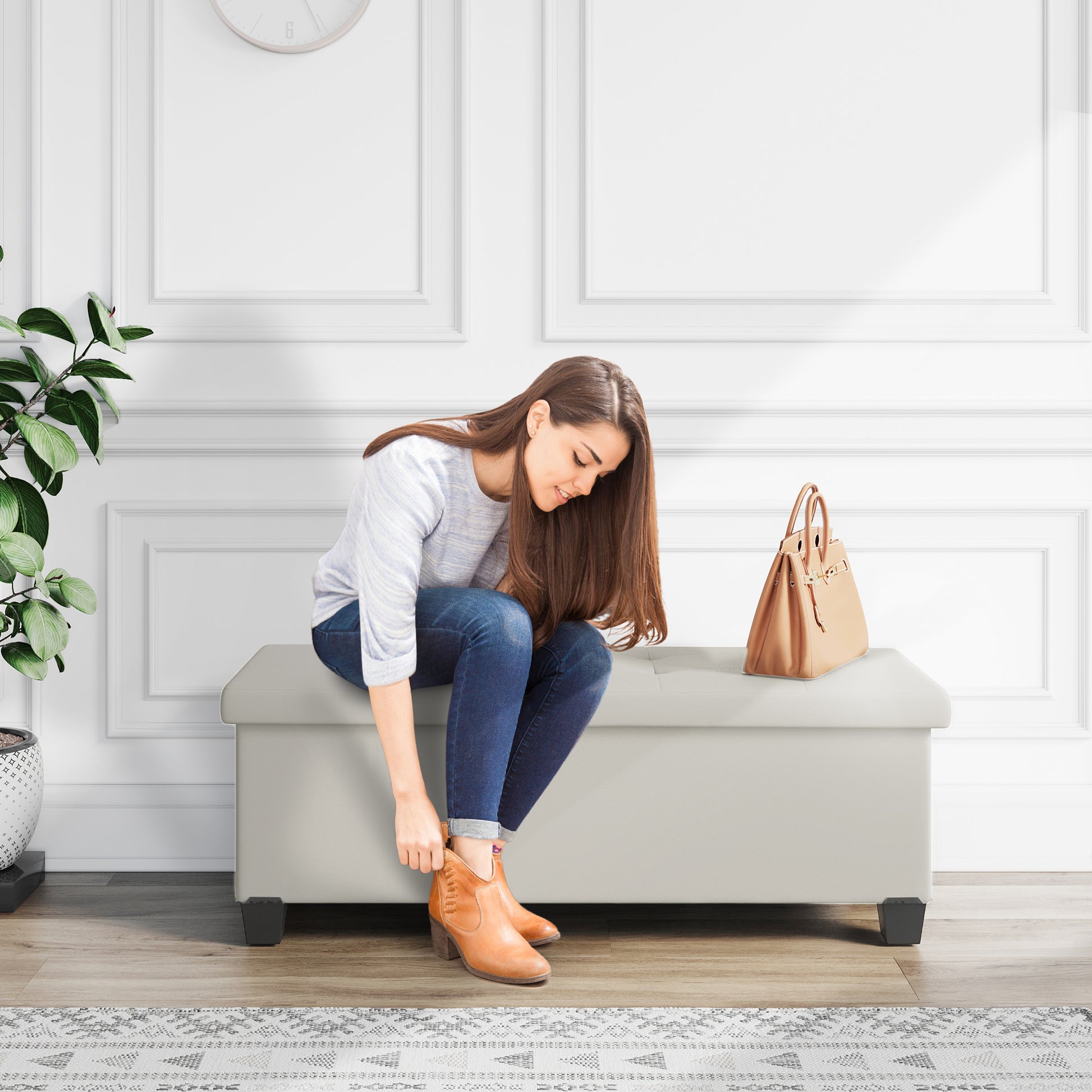 The Nestl tufted storage ottoman bench serves as a coffee table ottoman for living room or fall decor. This ottoman with storage is a perfect choice to help you make the most of your living space by acting as both a storage container and a comfertable ottoman or even a footrest. Our storage ottoman can fold flat when not in use, adapting the ottoman to suit your storage needs and when in need of additional seating. The durable fabric, gray ottoman helps organize essentials and accessories with this multipurpose storage bench. The sturdy, cushioned lid of our ottoman for bedroom storage is comfortable and supportive, with an invisible hinge design that allows it to be bent and lifted up from either side without removing the entire lid. The large ottoman space stores bulkier items like throw blankets and pillows.