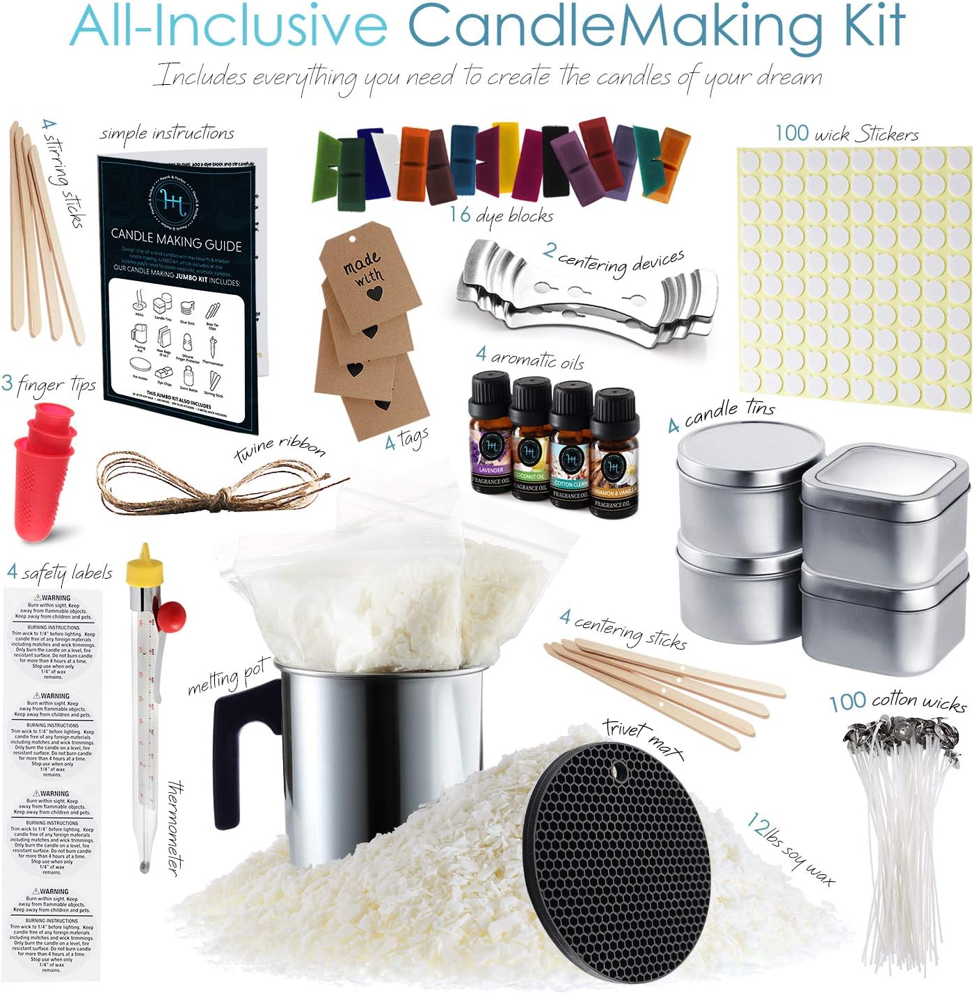 - CANDLE MAKING STARTER KIT: Kit Inclusions: 4 8oz soy wax bags, 16 dye blocks, 4 10ml fragrance oils, melting pot, trivet mat, thermometer, 2 round and 2 square 8oz candle tins with covers, 4 cotton wicks, 4 glue dots, 4 warning labels, 4 stirring sticks, 4 bow tie clips, 3 finger protectors, and 4 pieces of kraft card with 18-inch-long string. Includes Everything you need to make your own candles.
