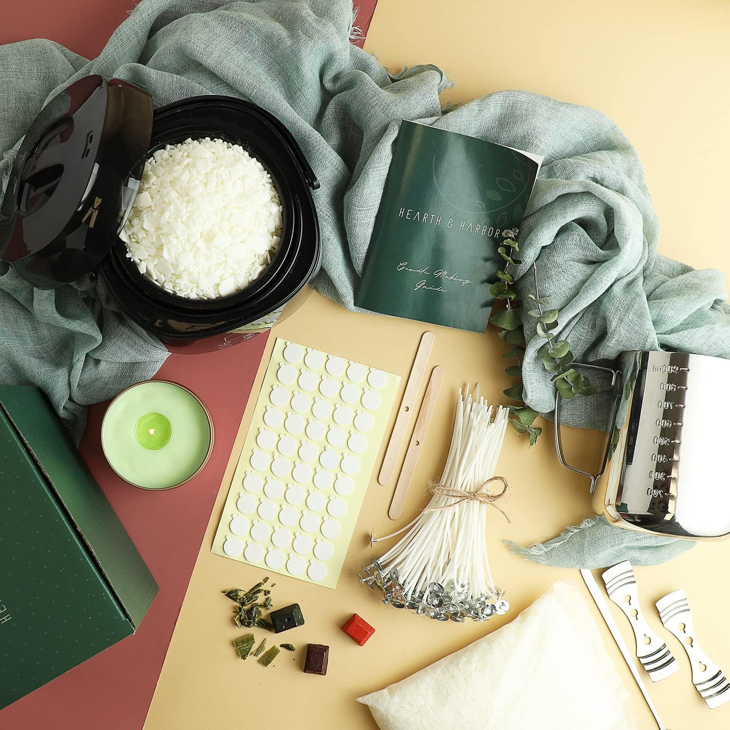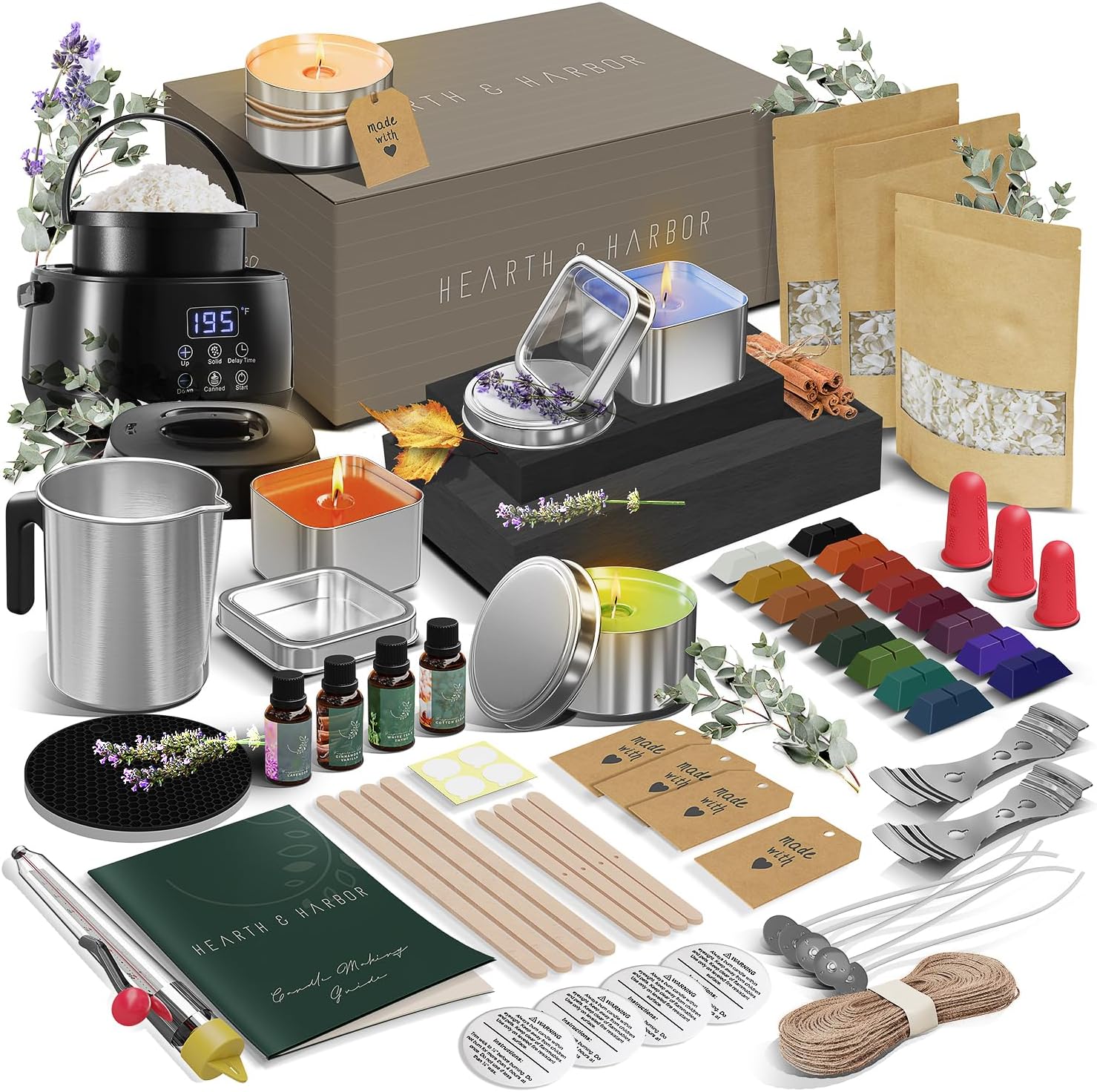- ELECTRIC WAX MELTING POT: Hearth & Harbor electric candle making machine kit has an LED touch screen, which can display real-time temperature,One key operation.The non-stick candle melting pot is insulated and easy to clean, come with very well written and simple-to-follow instructions that will help every beginner make handmade candles at home with ease and total safety.