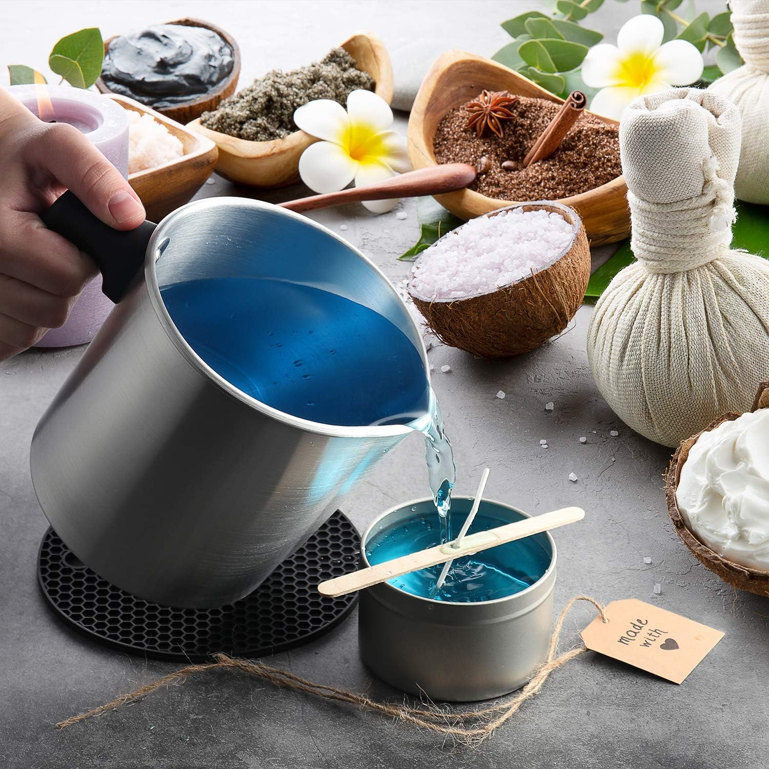 - PROTECTIVE SILICONE TRIVET MAT: The candle making pouring pitcher comes with a round, heat resistant silicone trivet mat that will protect your countertops, tables, and craft working area from the boiling hot wax container. The flexible silicone holder is very durable and easy to clean.