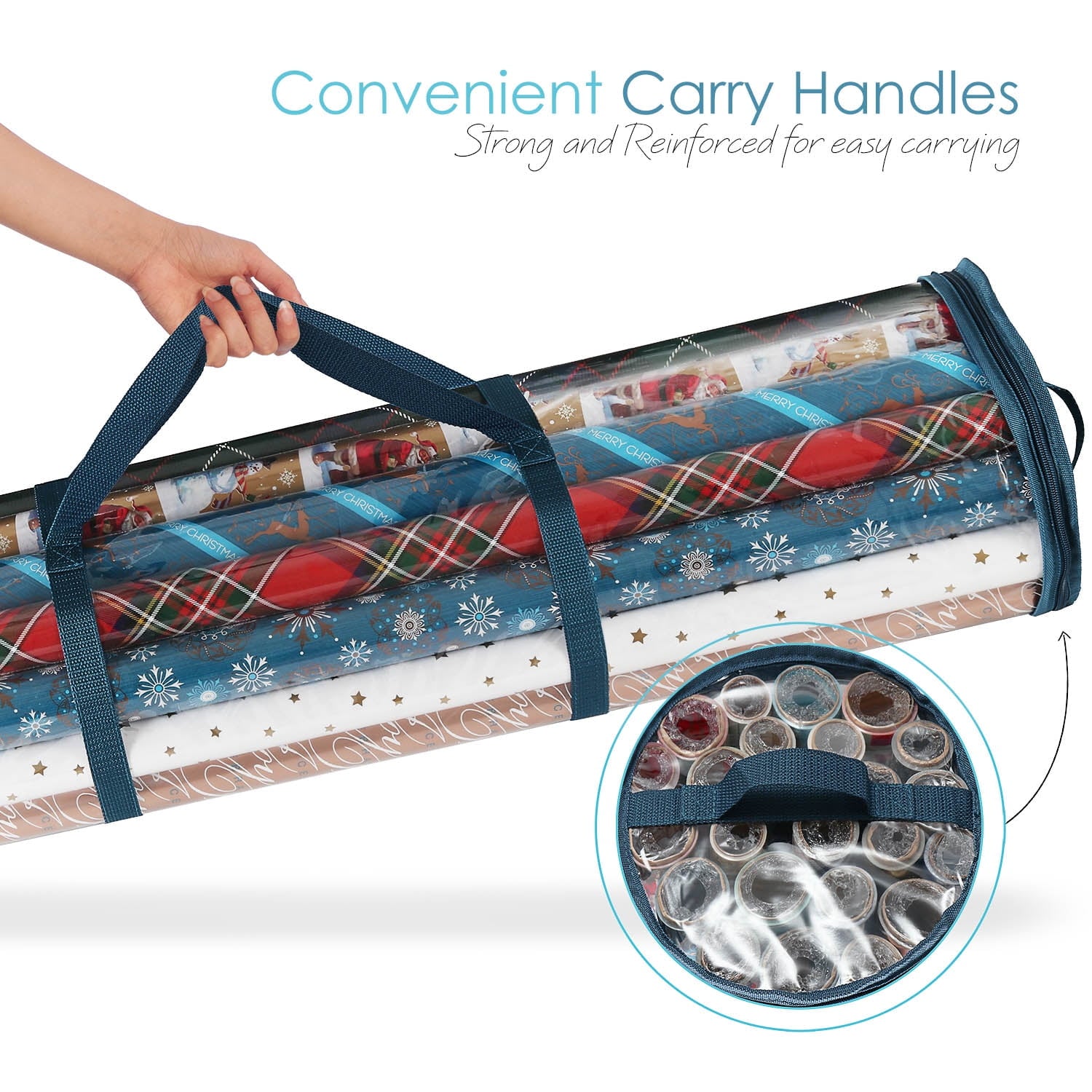 - CONVENIENT EXTRAS - 2 clear vinyl pockets keep bows, labels, tape, scissors, and other materials organized in the wrapping paper organizer. If you have 36 inch rolls or shorter, use the divider to add a compartment for extra accessories. Dual zipper closure keeps all your materials secure and easy to access.